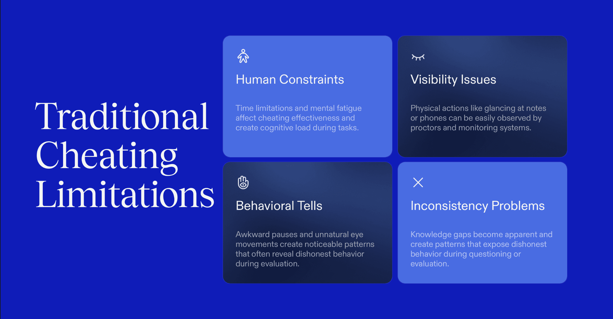 Proctoring alerts | Triggered on rule violations and visible misconduct | AI cheating does not break visible rules or create obvious violations |