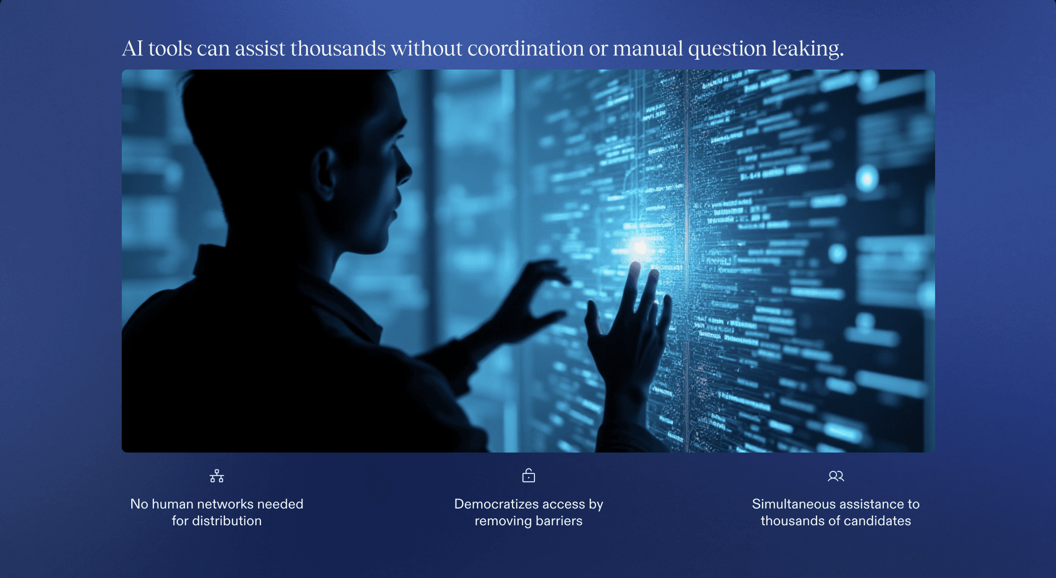 It scales effortlessly: A single AI tool can assist thousands of candidates simultaneously. There is no need to coordinate with other people or leak questions manually.