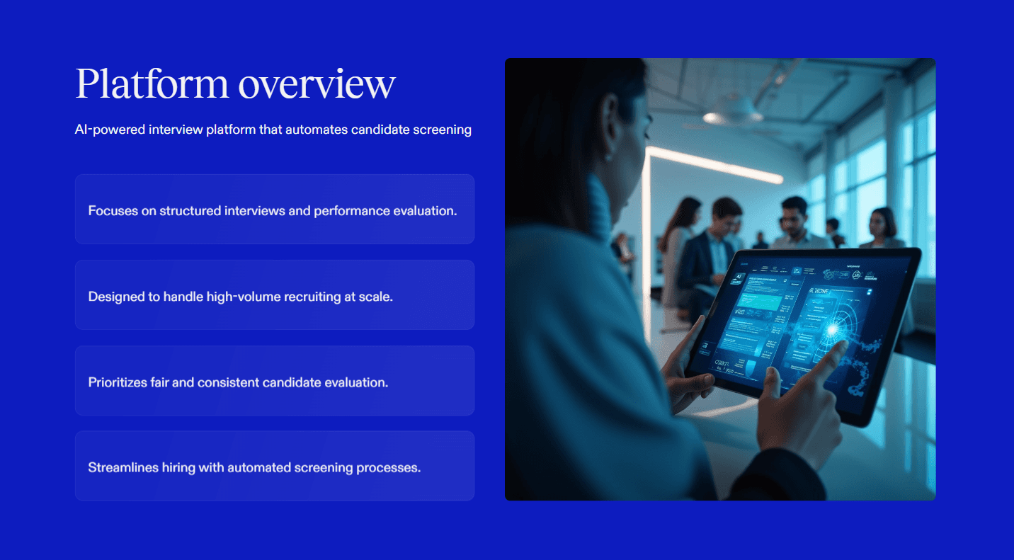 Asynchronous AI-powered video interviews that allow candidates to respond on their own schedule while ensuring consistent evaluation criteria across applicants.