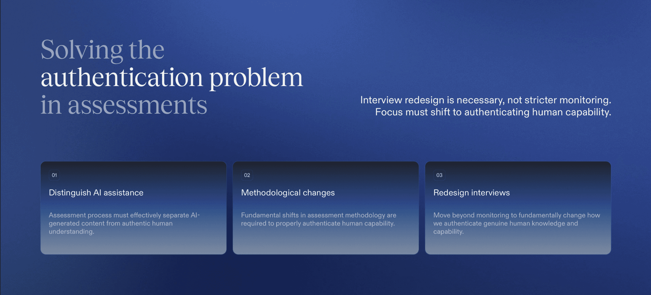 The solution to cheating isn’t stricter monitoring but it’ better design. Cheat-resistant interviews don’t try to catch candidates in the act; they make external assistance less useful in the first place.