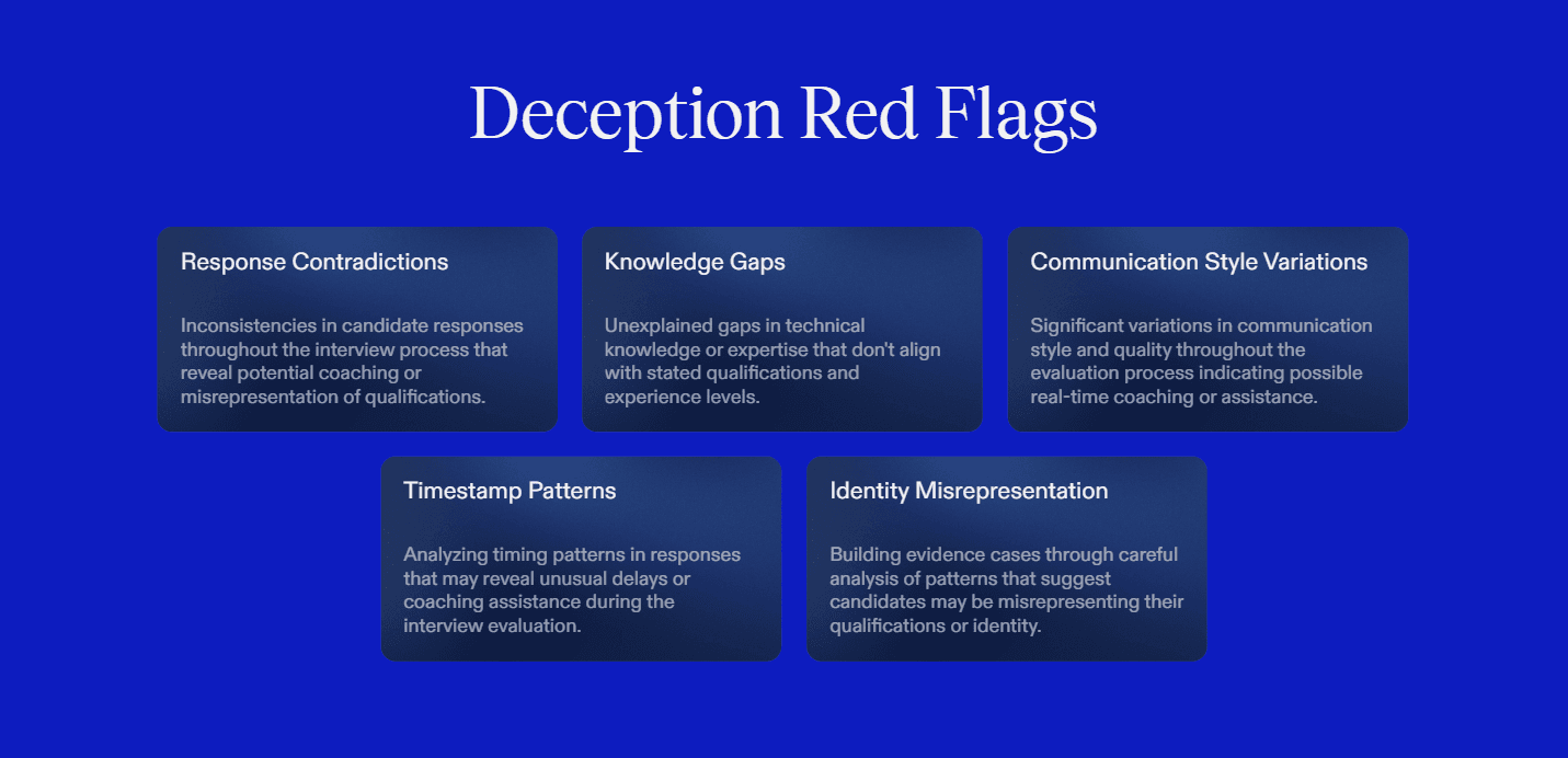 These signals are often subtle on their own, but patterns across multiple red flags can indicate interview assistance, identity misrepresentation, or skill fabrication.