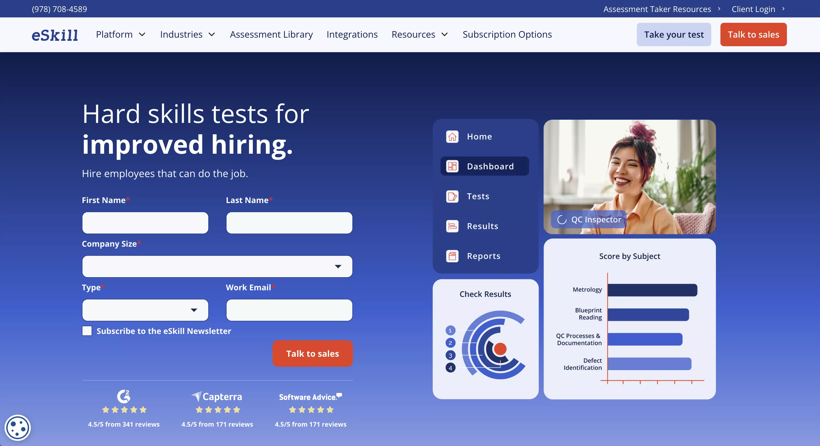 eSkill is a skills assessment platform that offers a wide range of pre-employment tests, including technical, cognitive, and behavioral evaluations. It includes built-in proctoring features and activity monitoring to help maintain test integrity for remote assessments.