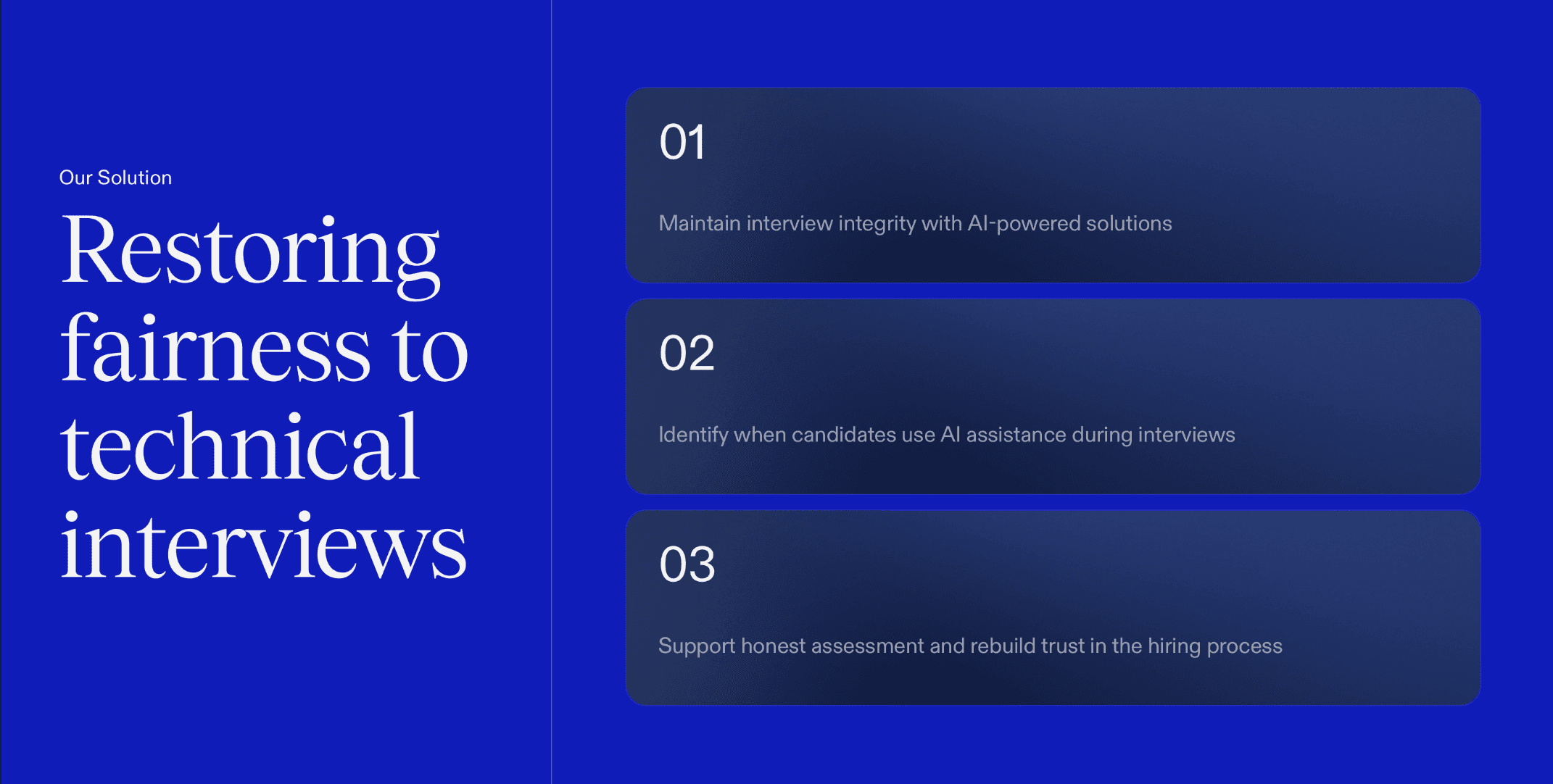 The system works as an assistive layer that empowers interviewers to ask better follow up questions and make informed decisions.Respects candidate privacy