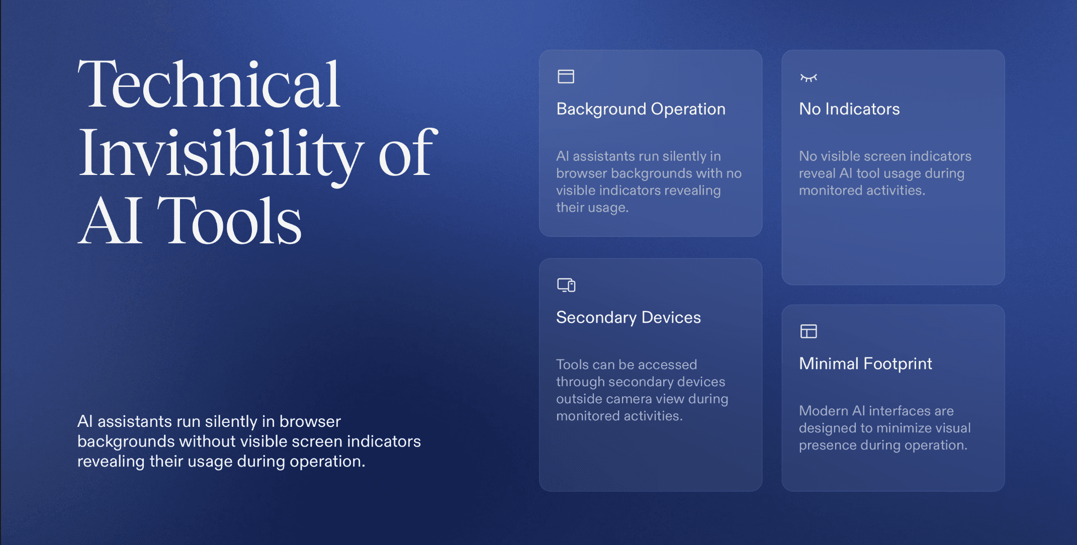 Because these tools run locally, in browsers, or on separate devices, they rarely appear in screen shares or application logs. This makes AI assistance difficult to identify using traditional monitoring methods.