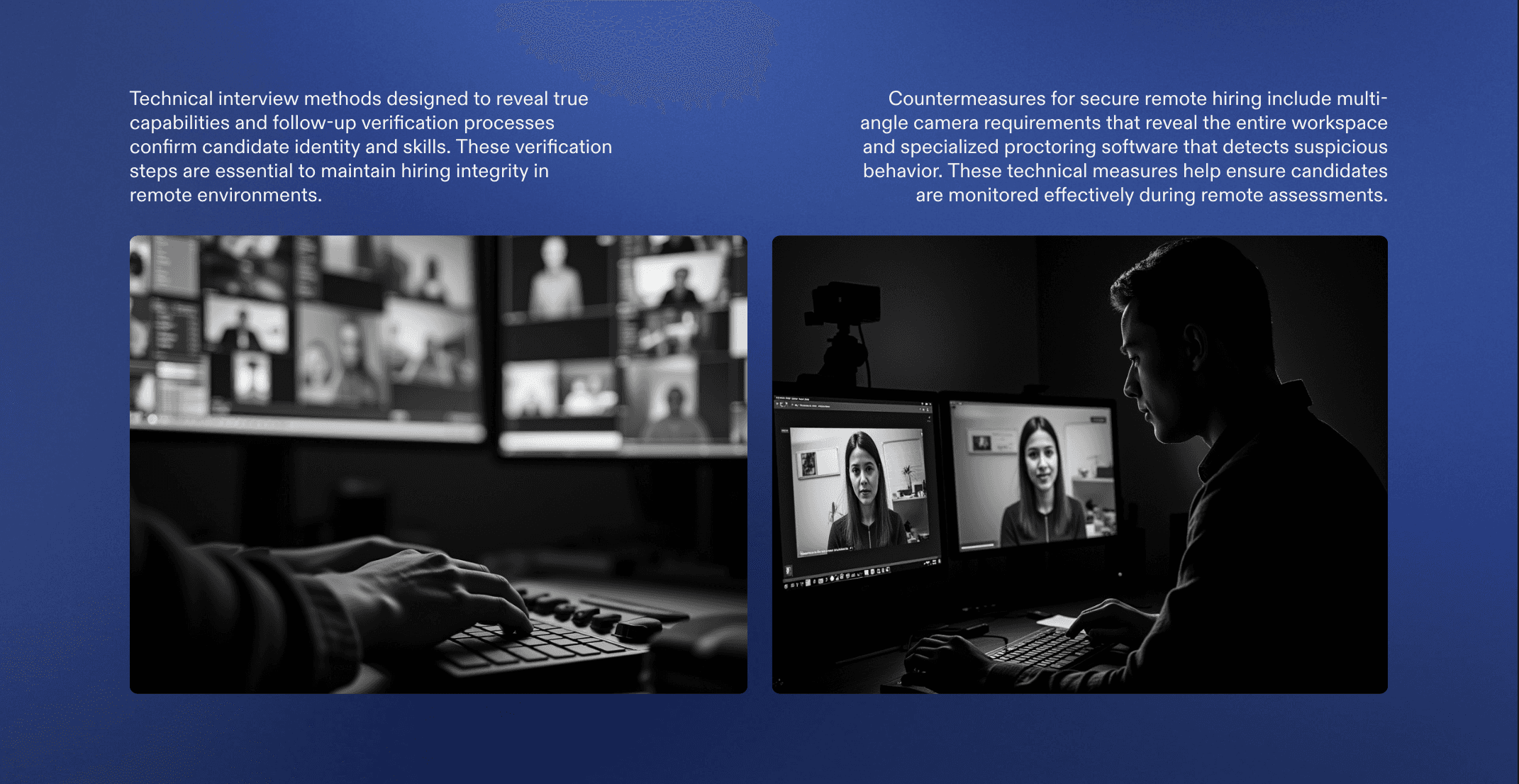 Finally, candidates may manipulate screen sharing, virtual backgrounds, or camera angles to hide deceptive behavior. For instance, a candidate could share only a portion of their screen, hide a second monitor, or use lighting and camera tricks to mask other devices in the room.