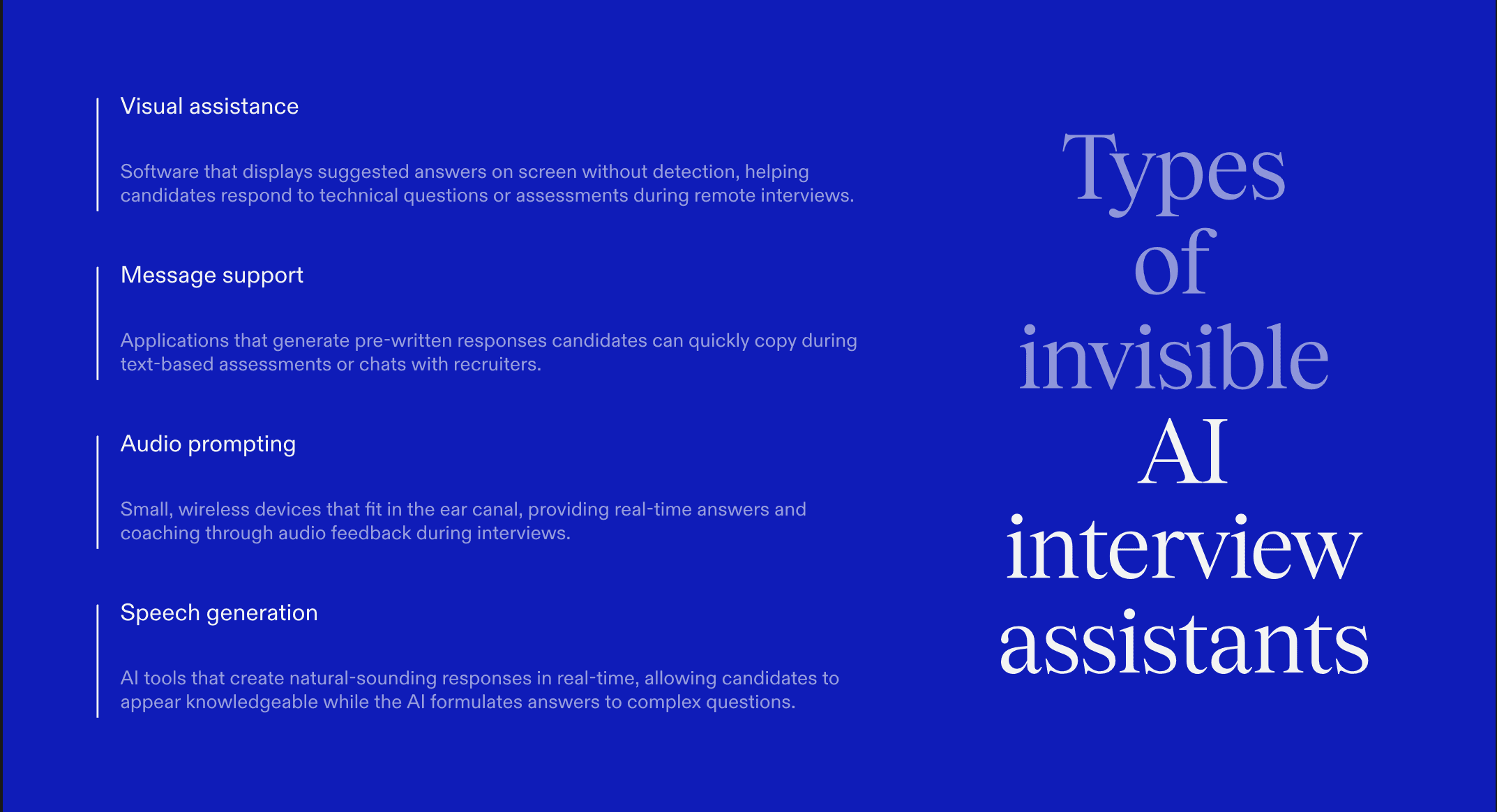 Hidden AI copilots that run outside of browsers and are not captured by screen sharing. These can feed real-time answers or code suggestions directly into the candidate’s workflow without visible windows.