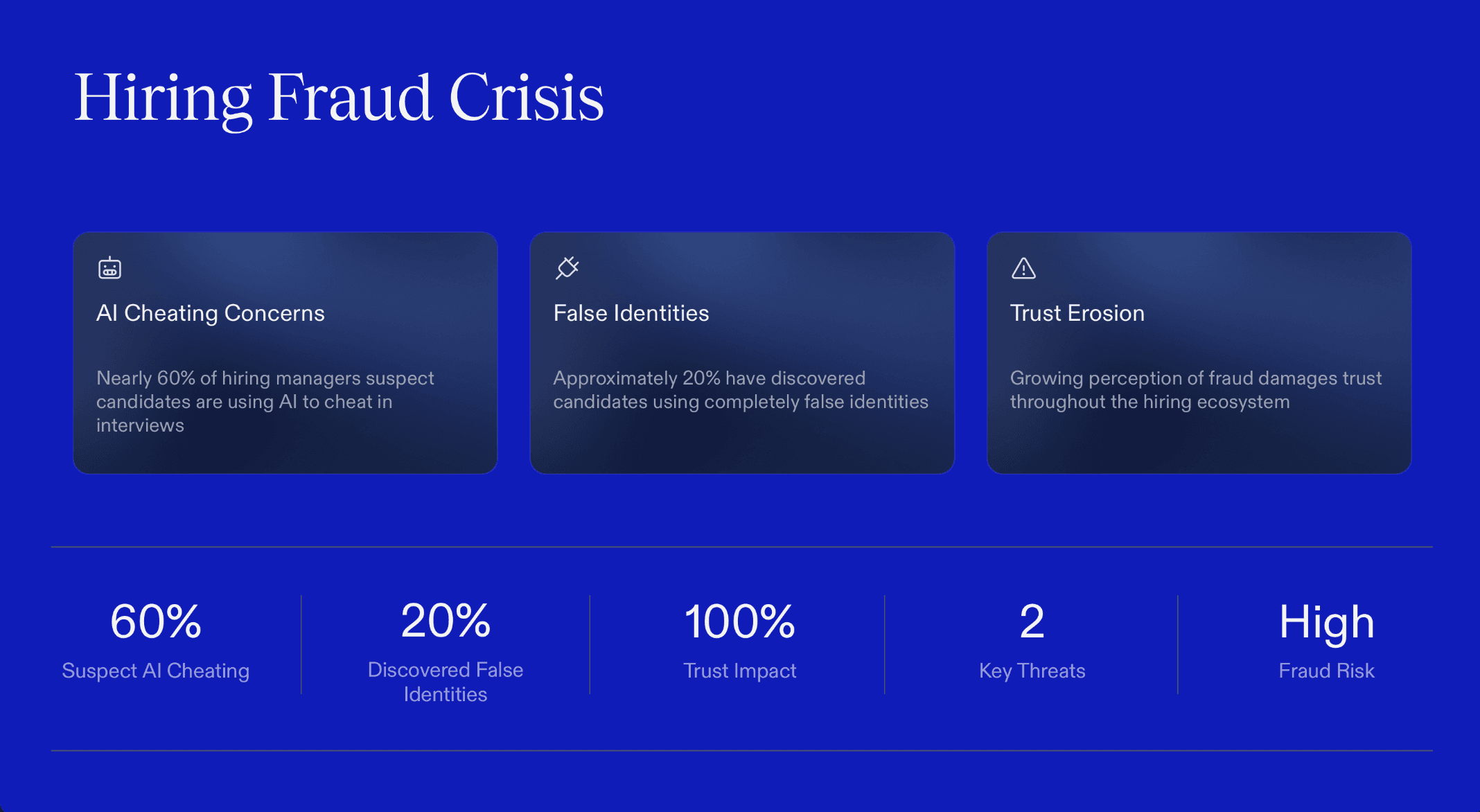 Unreliable identity: A survey of U.S. hiring managers found 31% had interviewed someone who later turned out to be using a false identity, and nearly two-thirds suspected candidates using AI to misrepresent themselves.