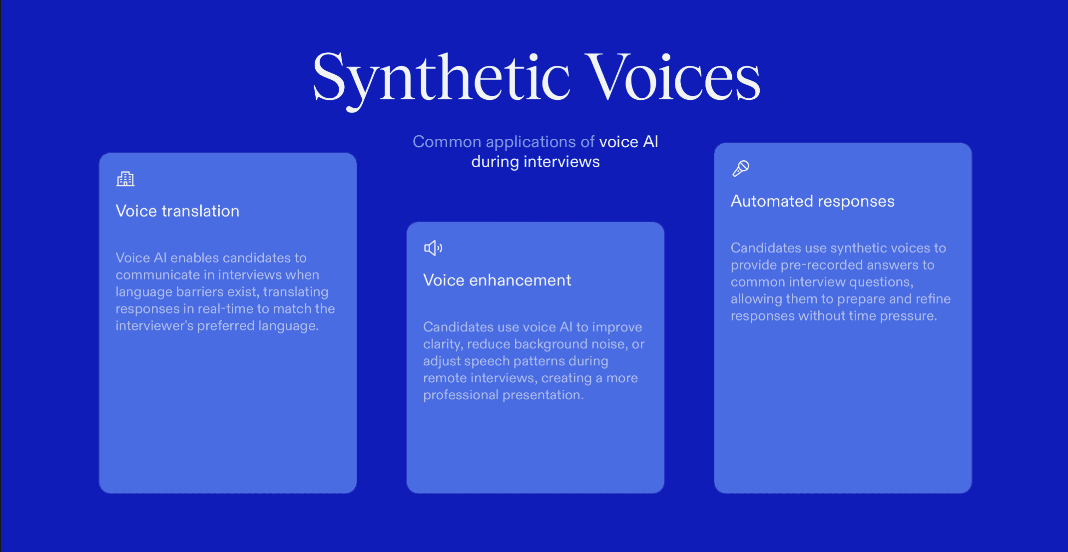 Synthetic voices are AI generated speech created using voice cloning or text to speech systems. In an interview setting, candidates may: