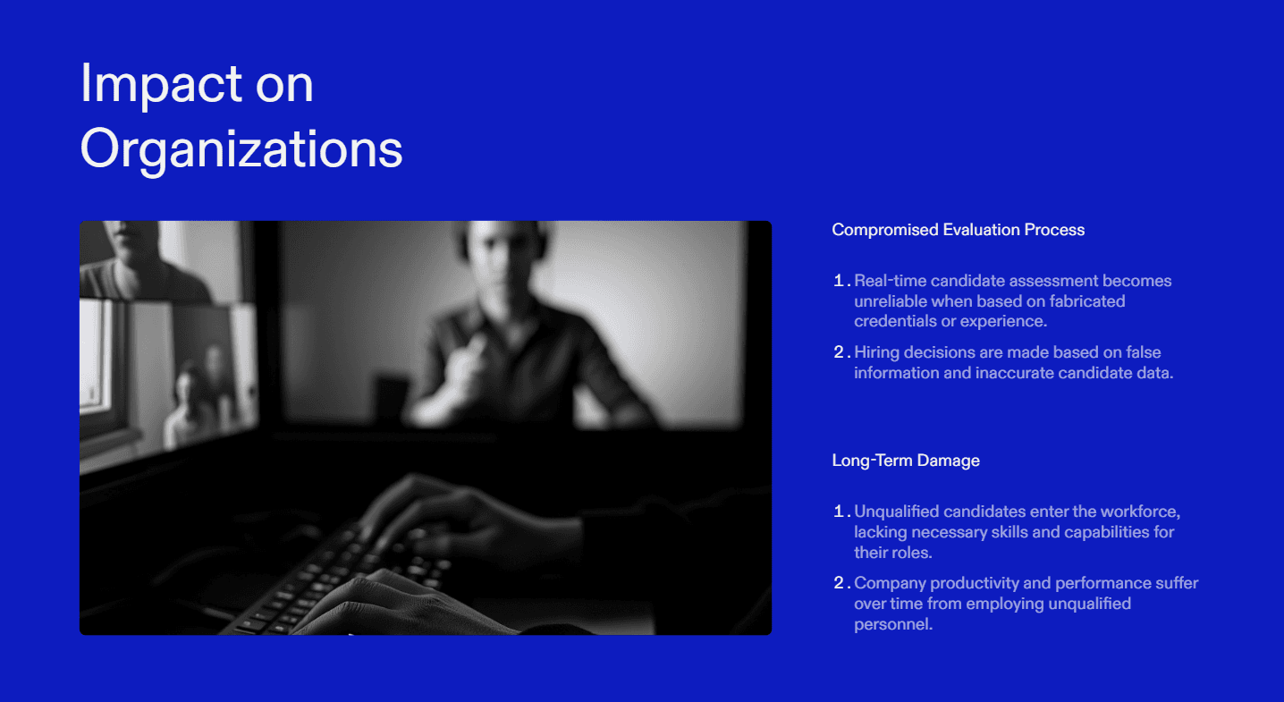 Online interview fraud directly compromises real time evaluation. Hiring decisions are made based on false signals, which leads to unqualified hires entering organizations.