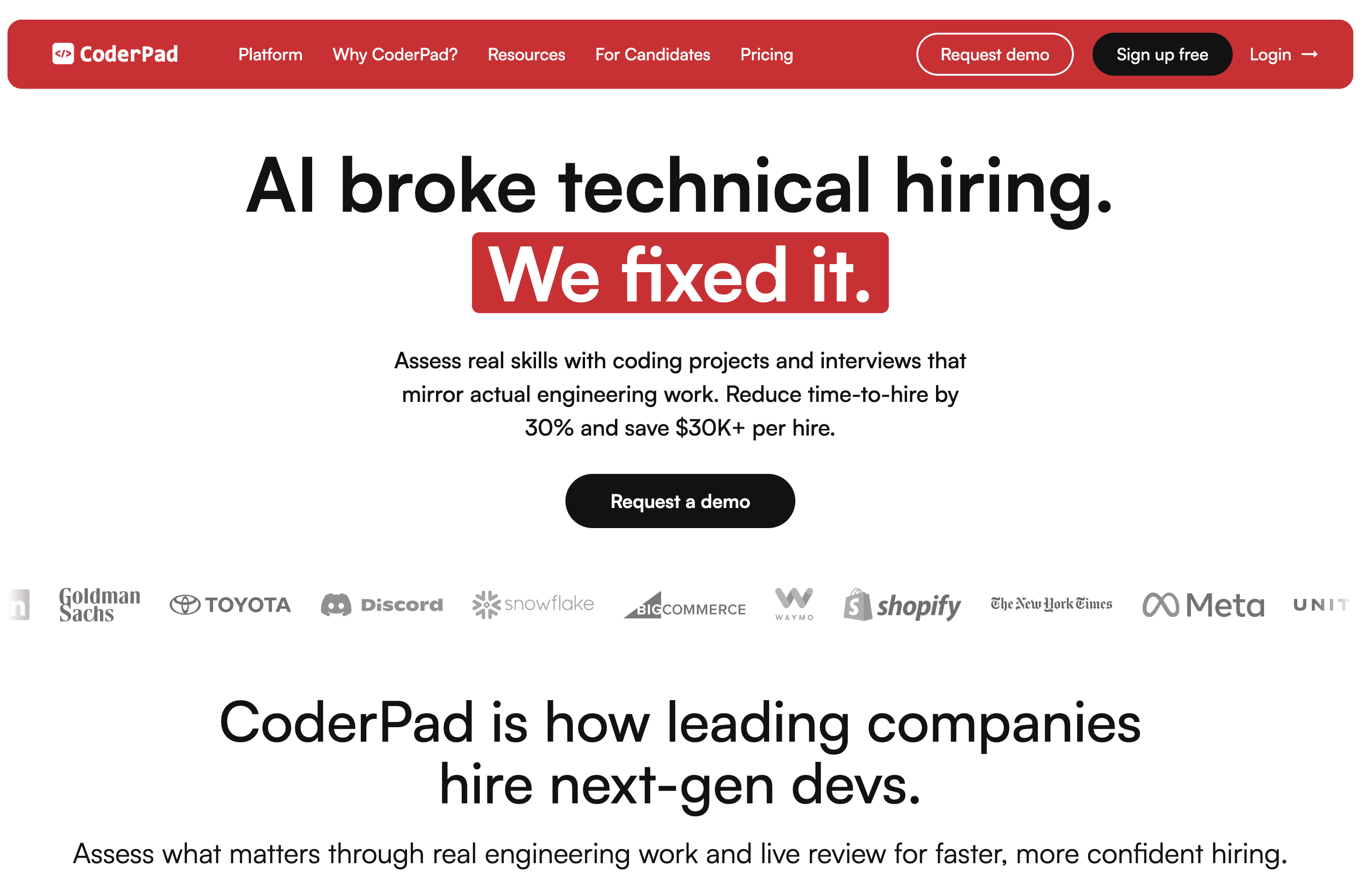 CoderPad is a real-time coding interview platform that allows recruiters to observe how candidates solve problems live. It emphasizes transparency and practical evaluation.