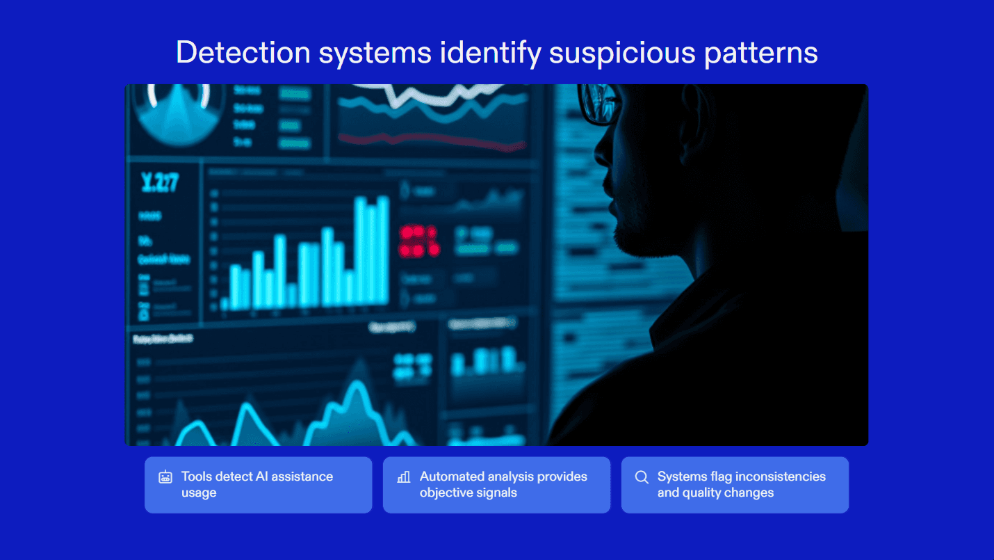 Detection and proctoring tools help recruiters validate whether interview performance reflects real, independent ability. Detection systems analyze behavioral and response patterns such as sudden changes in answer quality, unnatural pauses, or inconsistencies across rounds that often indicate AI assistance or external support. This gives hiring teams objective signals they cannot reliably spot through conversation alone.