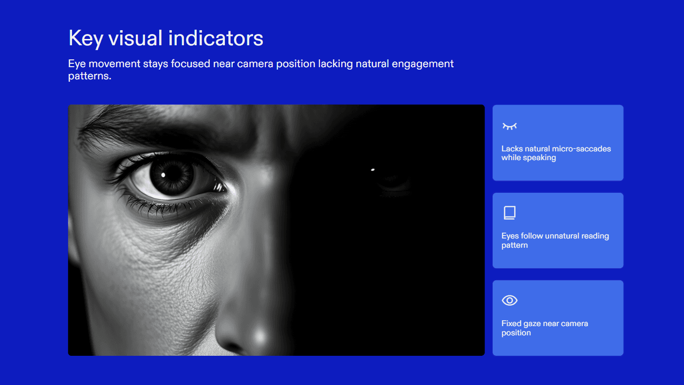 Eye gaze sticks near the camera but lacks micro-saccade variation