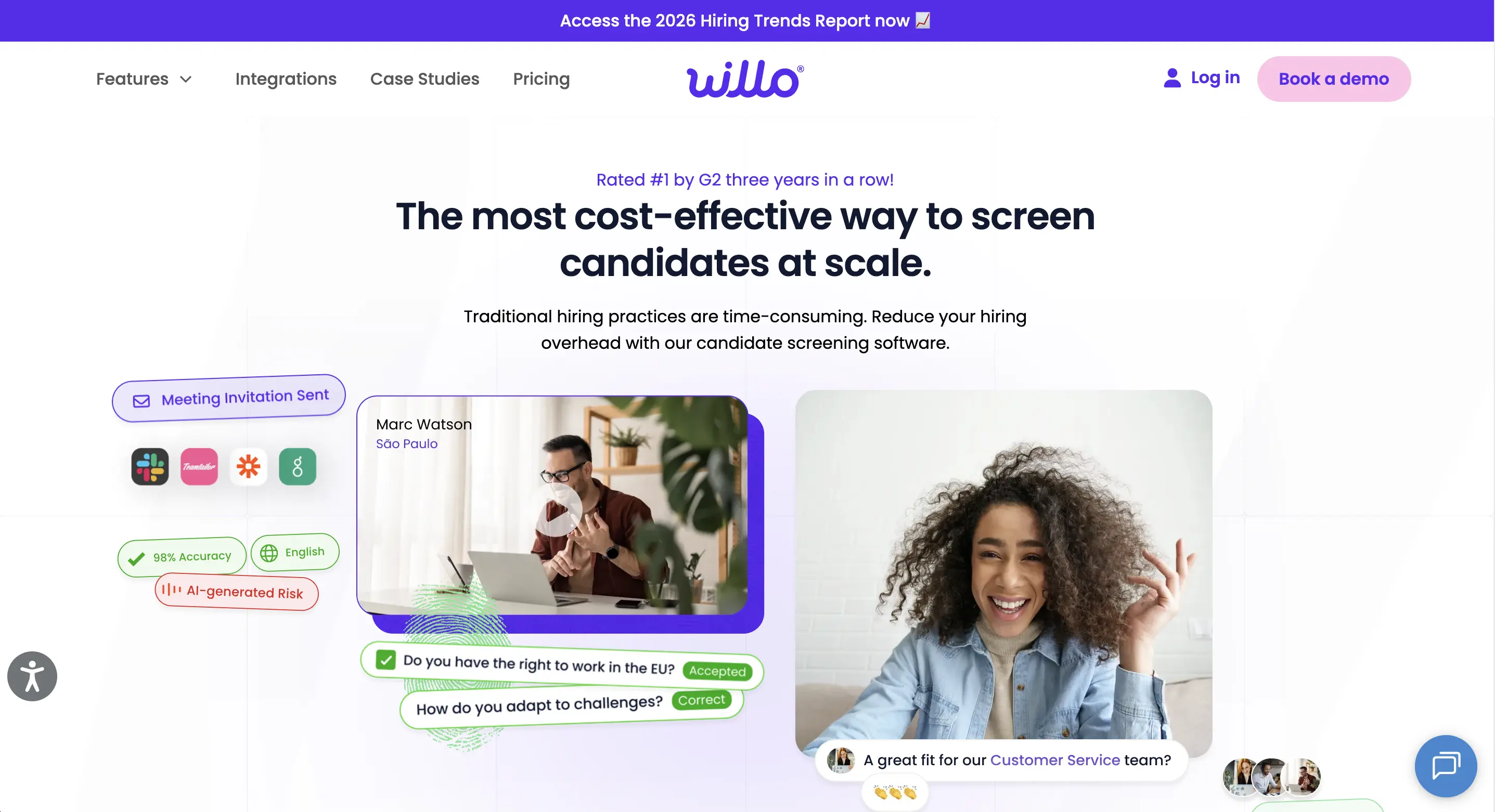 Willo is an asynchronous video interview and candidate screening platform that helps hiring teams capture authentic candidate responses while minimizing scheduling friction. To support authenticity verification, Willo includes features such as digital identity checks and AI analysis of responses that help recruiters distinguish genuine answers from scripted or AI‑generated ones.