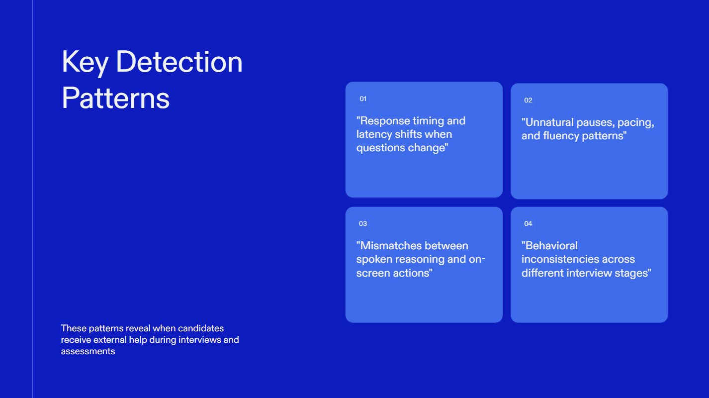 Most interview cheating today is not obvious. Candidates using live AI tools, collaborators, or proxies don’t break rules loudly. Instead, they leave behind behavioral patterns that are hard to spot manually, especially in long or fast-paced interviews.