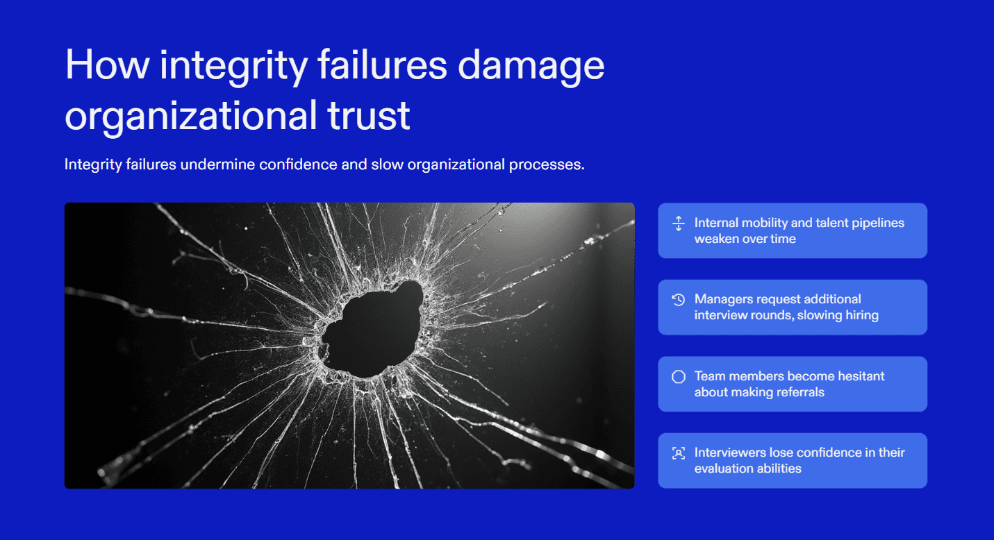 The impact does not stop with a mis‑hire. Integrity failures damage trust across the organization: